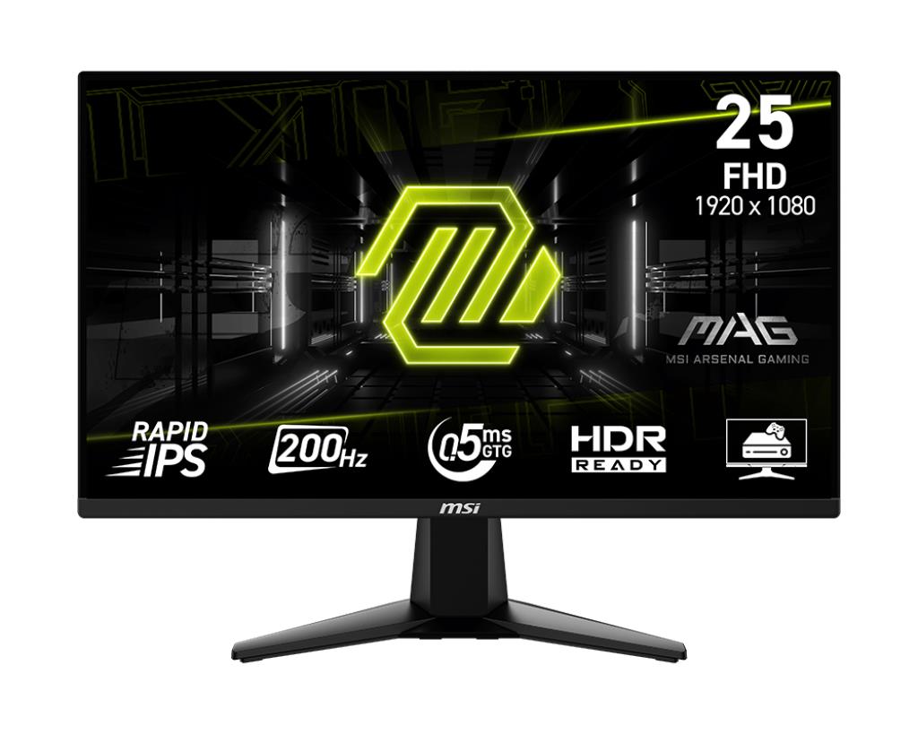 Experience immersive gaming with the MAG 255F E20 gaming monitor. It features a 1920x1080 (FHD) panel, a 200Hz refresh rate, and a rapid 0.5ms (GtG, Min) response time. The monitor is HDR ready, enhancing eye-catching details through adjustments in contrast and shadows. Designed for competitive FPS, first-person RPG/MMORPG, and flight/racing simulator genres, the MSI MAG 255F E20 Gaming Monitor takes casual gaming to a new level, challenging players to see beyond the game.