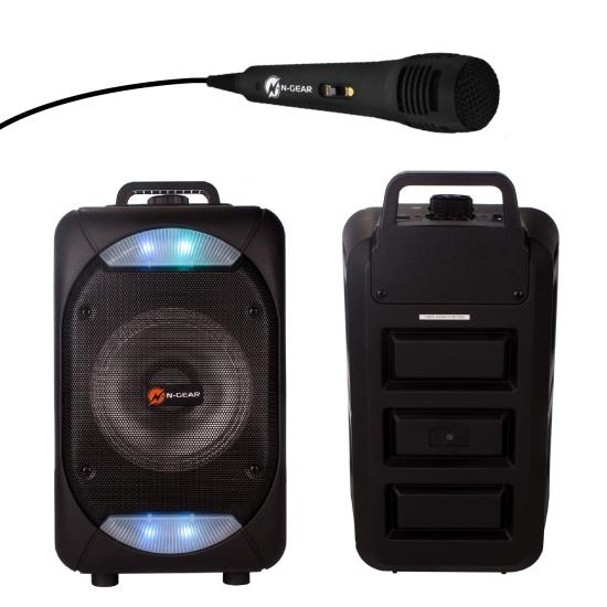 With the new FLASH 610 from N-GEAR you have the party in your hands! The FLASH 610 has a power of 100 watts with a 6 "inch (16 cm) woofer and a playing time of no less than 6 hours! Connect your phone and/or tablet via Bluetooth and sing along to your favorite songs via the included microphone. in the front panel makes your party complete, you can also connect an SD card, a USB or an AUX device!Heavy sound, light movement, party mode, karaoke mode, wireless fun, easy to use, easy to charge, easy to connect, easy to party.